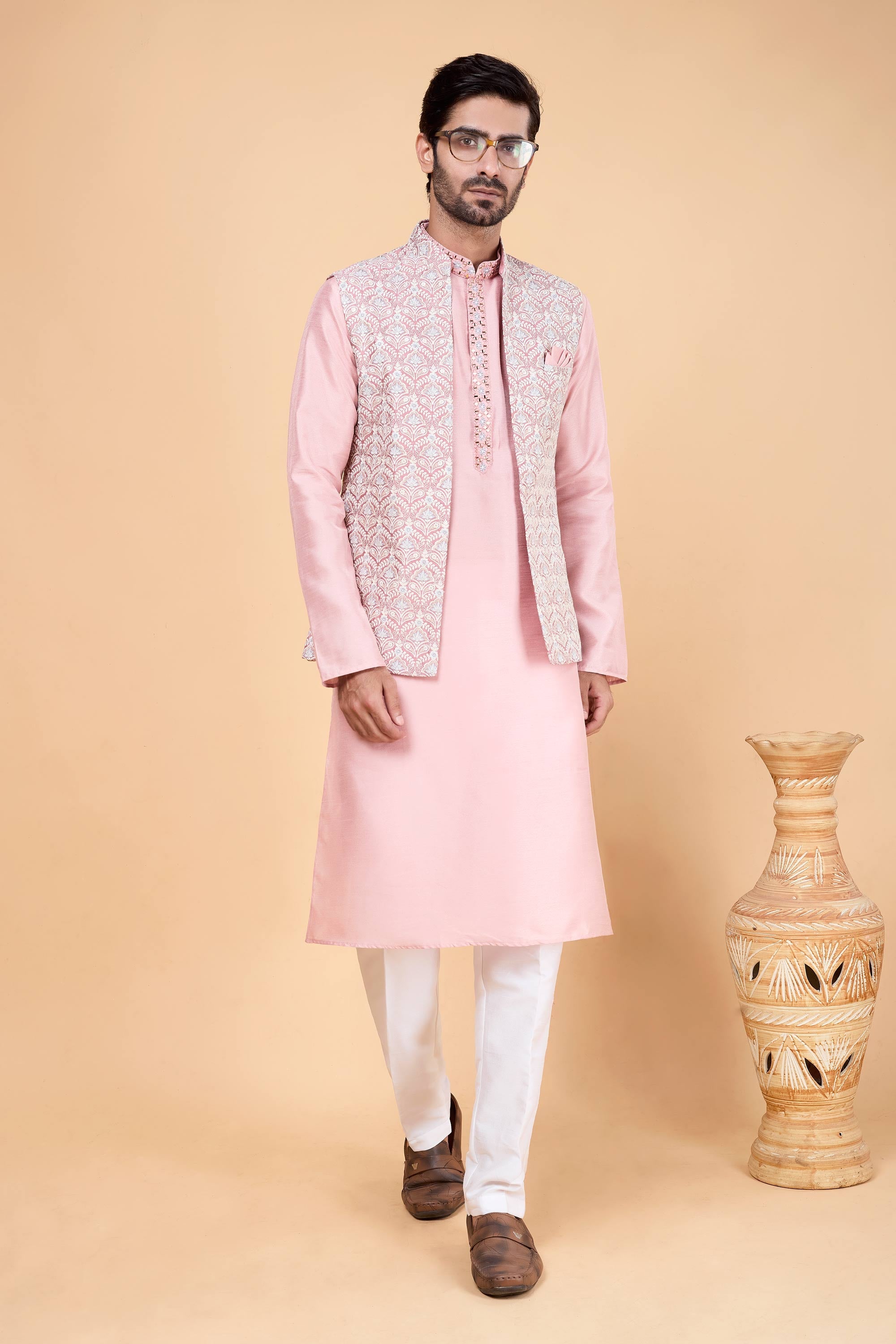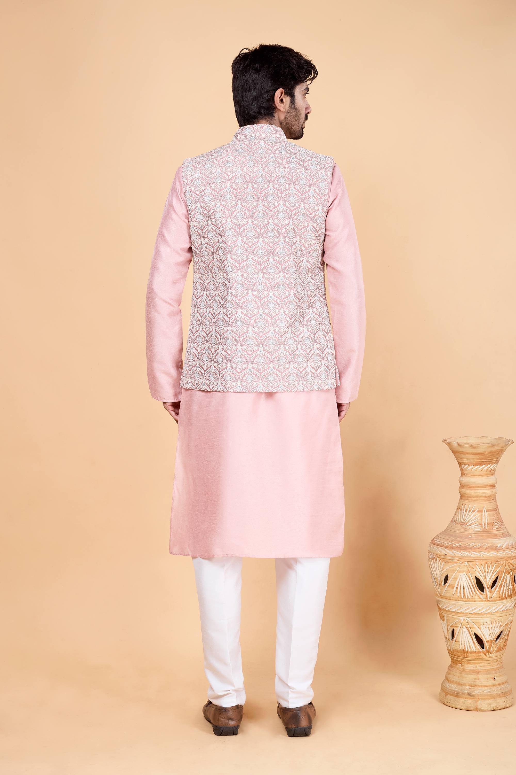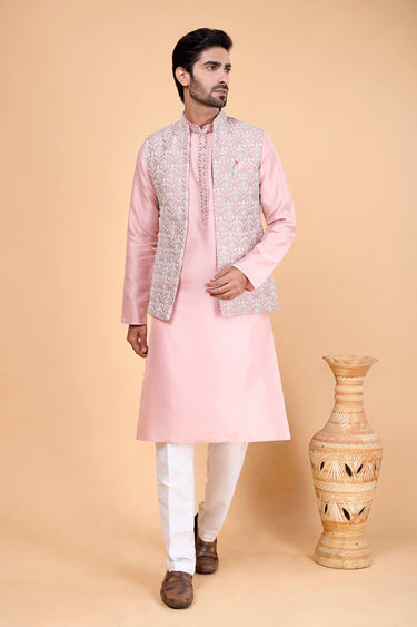 Art Silk Fabric Pink Readymade Kurta And Aligadhi Pant With 3 Pcs Jacket Set For Men