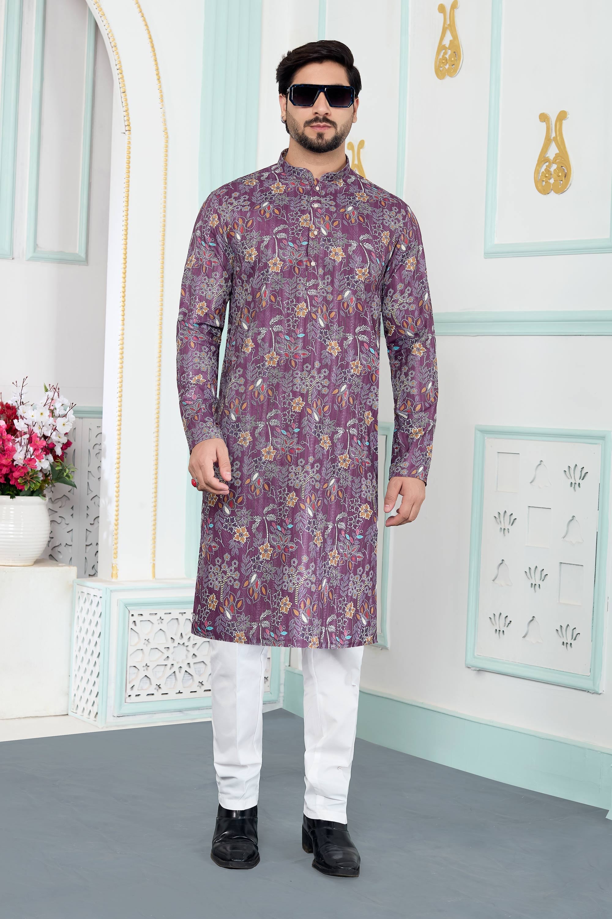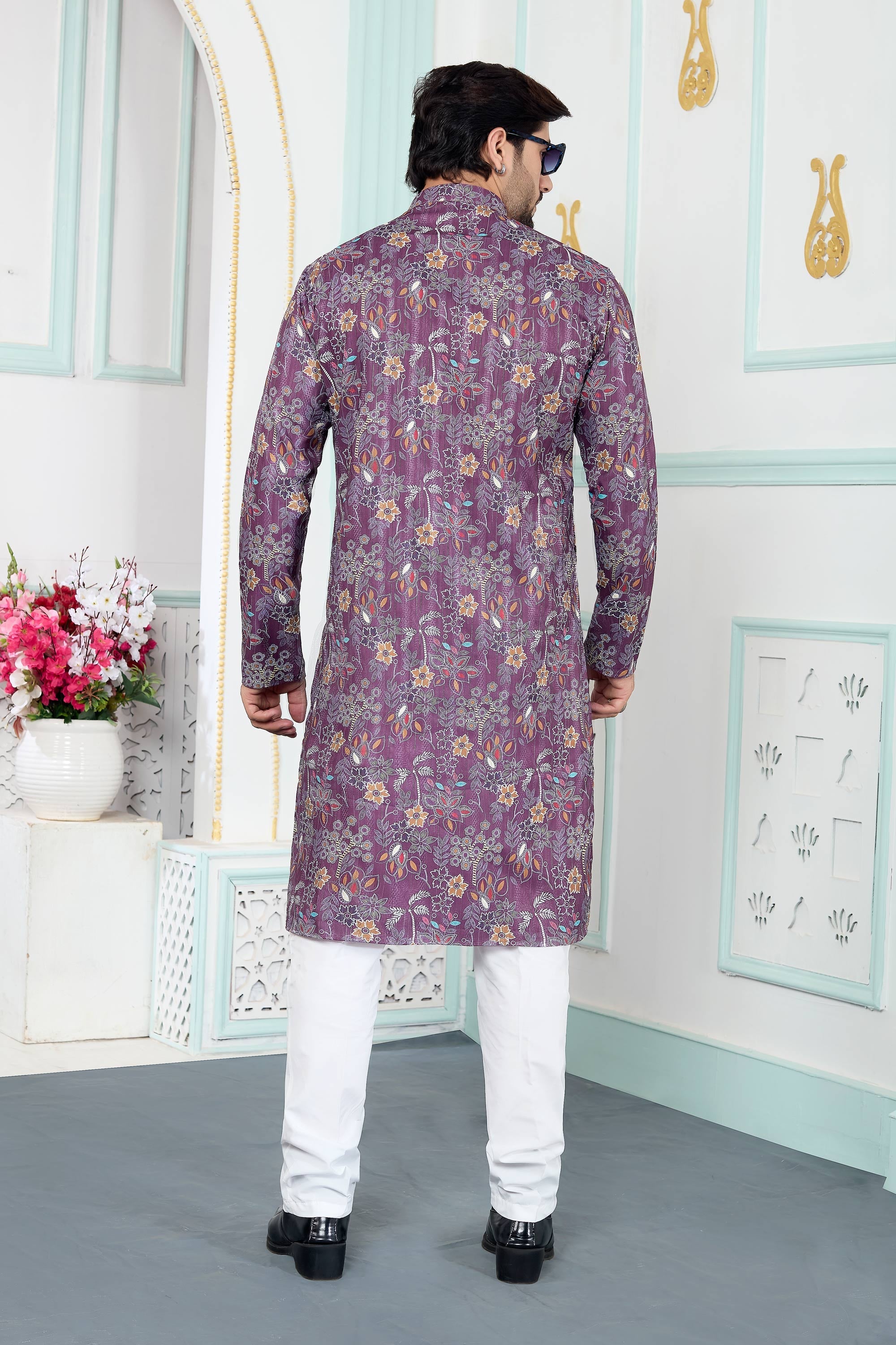 Art Silk Fabric Purple Function Wear Readymade Kurta Pyjama For Men