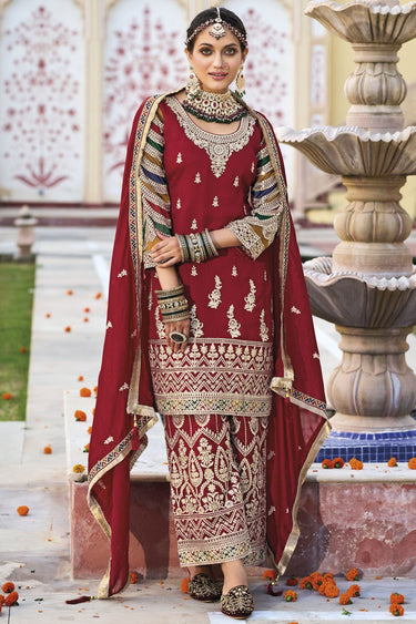 Art Silk Fabric Red Color Beatific Look Readymade Embroidered Salwar Suit