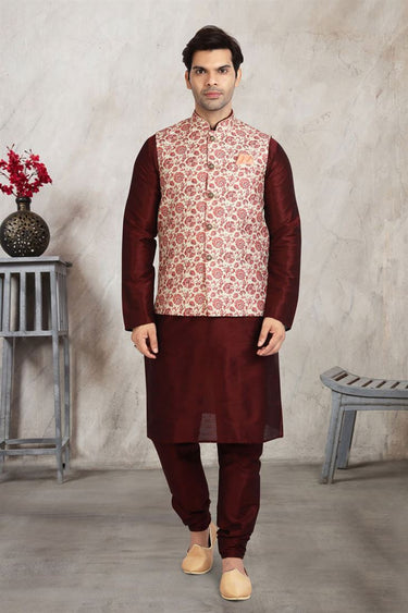 Art Silk Fabric Wedding Wear Banarasi Style Kurta Pyjama In Maroon Color