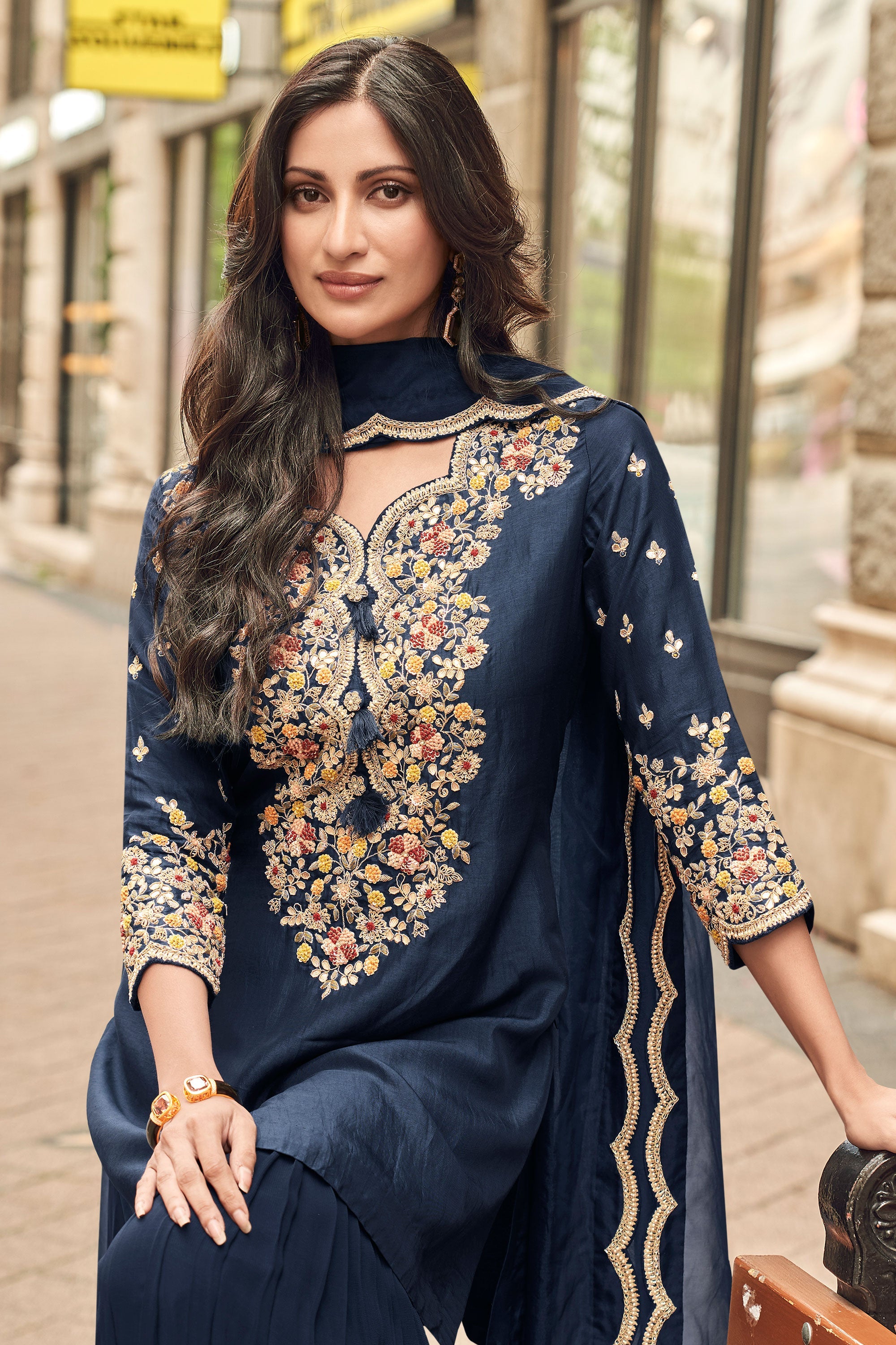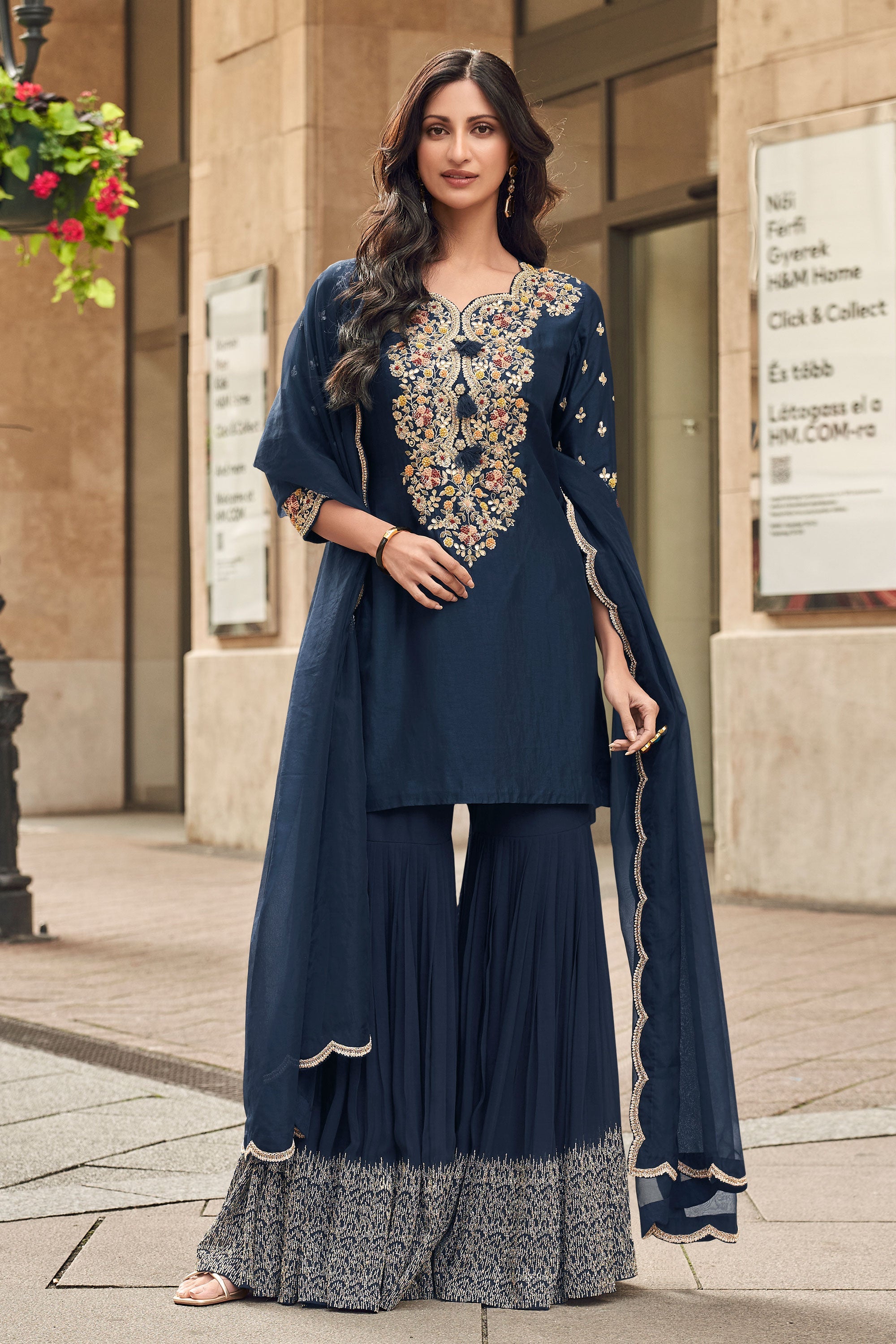 Art Silk Navy Blue Embroidered Readymade Gharara Salwar Suit