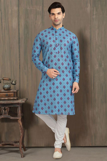 Attractive Cotton Fabric Light Cyan Color Printed Kurta Pyjama In Sangeet Wear