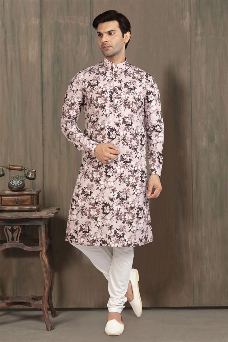 Attractive Cotton Fabric Peach Color Printed Kurta Pyjama In Sangeet Wear