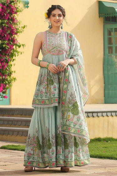 Attractive Festival Wear Sea Green Color Readymade Muslin Fabric Palazzo Suit
