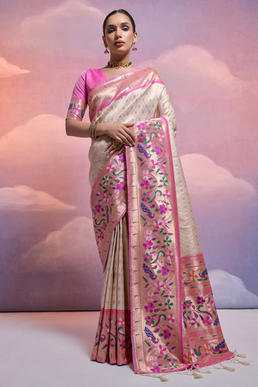 Attractive Off White Meenakari Zari Weaving Border Work Paithani Silk Traditional Saree