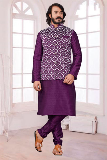 Attractive Purple Color Art Silk Fabric Sangeet Wear Readymade Kurta Pyjama With Designer Jacket