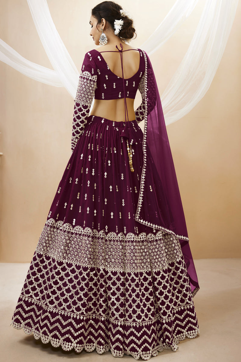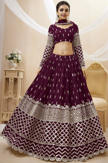 Awesome Embroidered Work On Georgette Fabric Wine Color Lehenga Choli