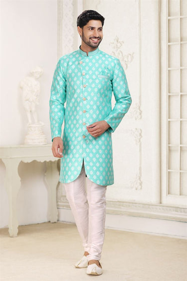 Banarasi Jacquard Cyan Color Wedding Wear Readymade Designer Men Indo Western