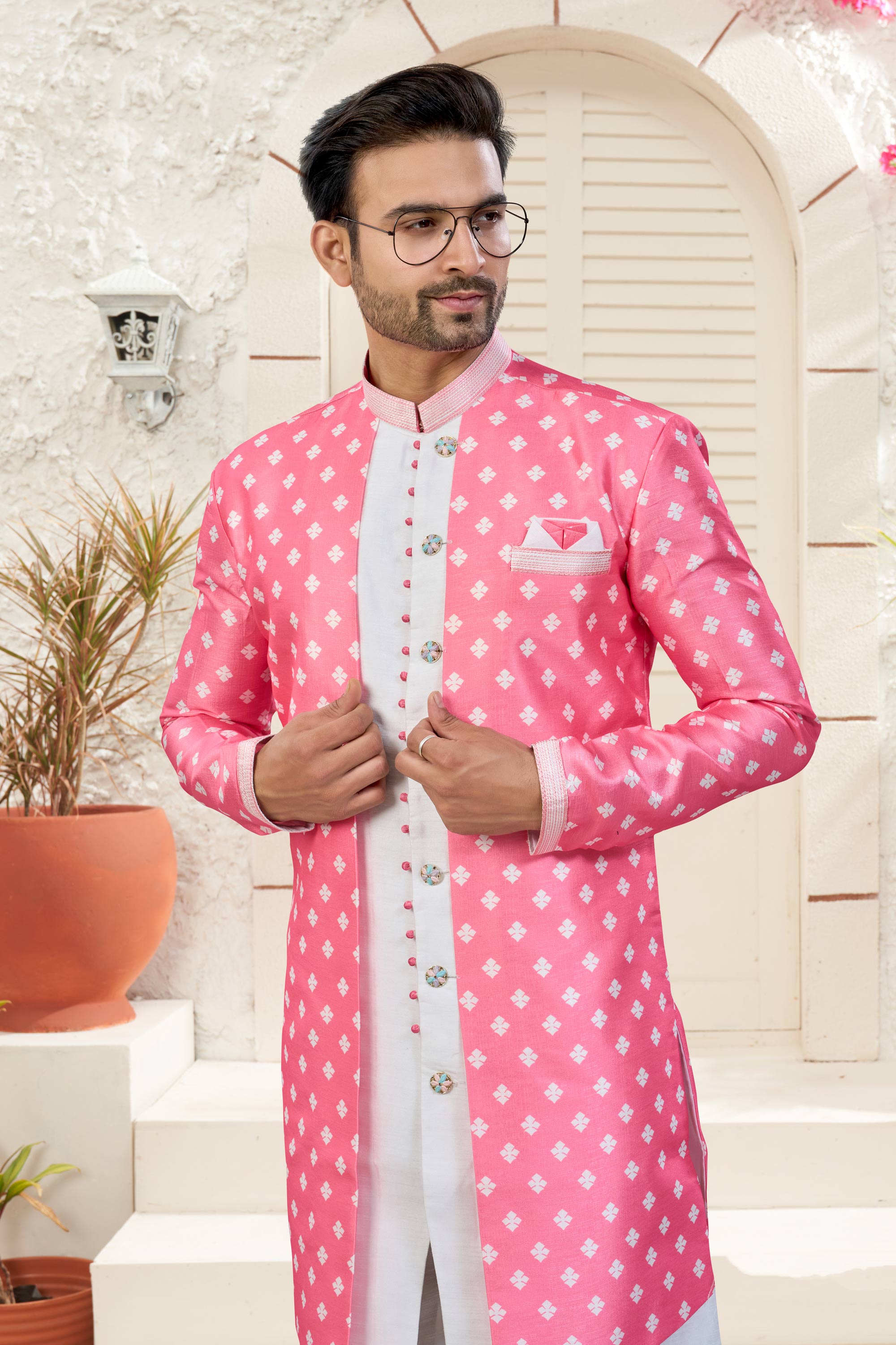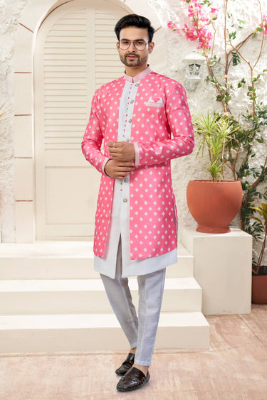 Elevate your festive style with this Mens Readymade Indo Western Outfit designed for elegance and comfort. The ensemble features a stylish top paired with a Silk Dhupion pyjama bottom that offers a rich texture and refined finish. The rich color enhances its royal appeal, making it an ideal choice for weddings and special occasions. Please note that slight color variations may occur due to digital photography.