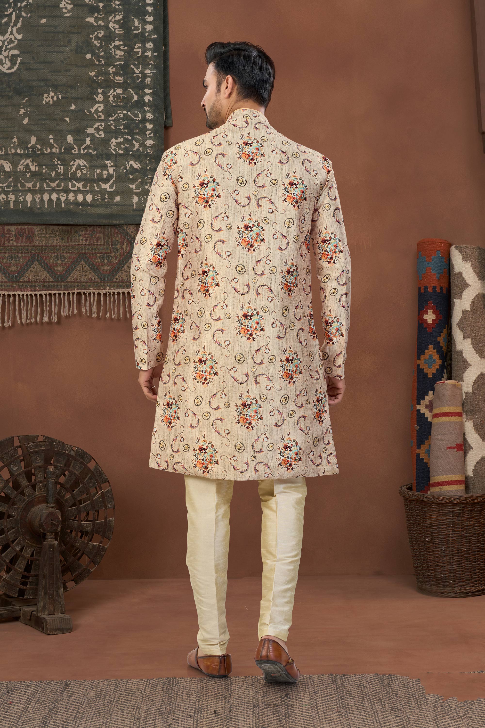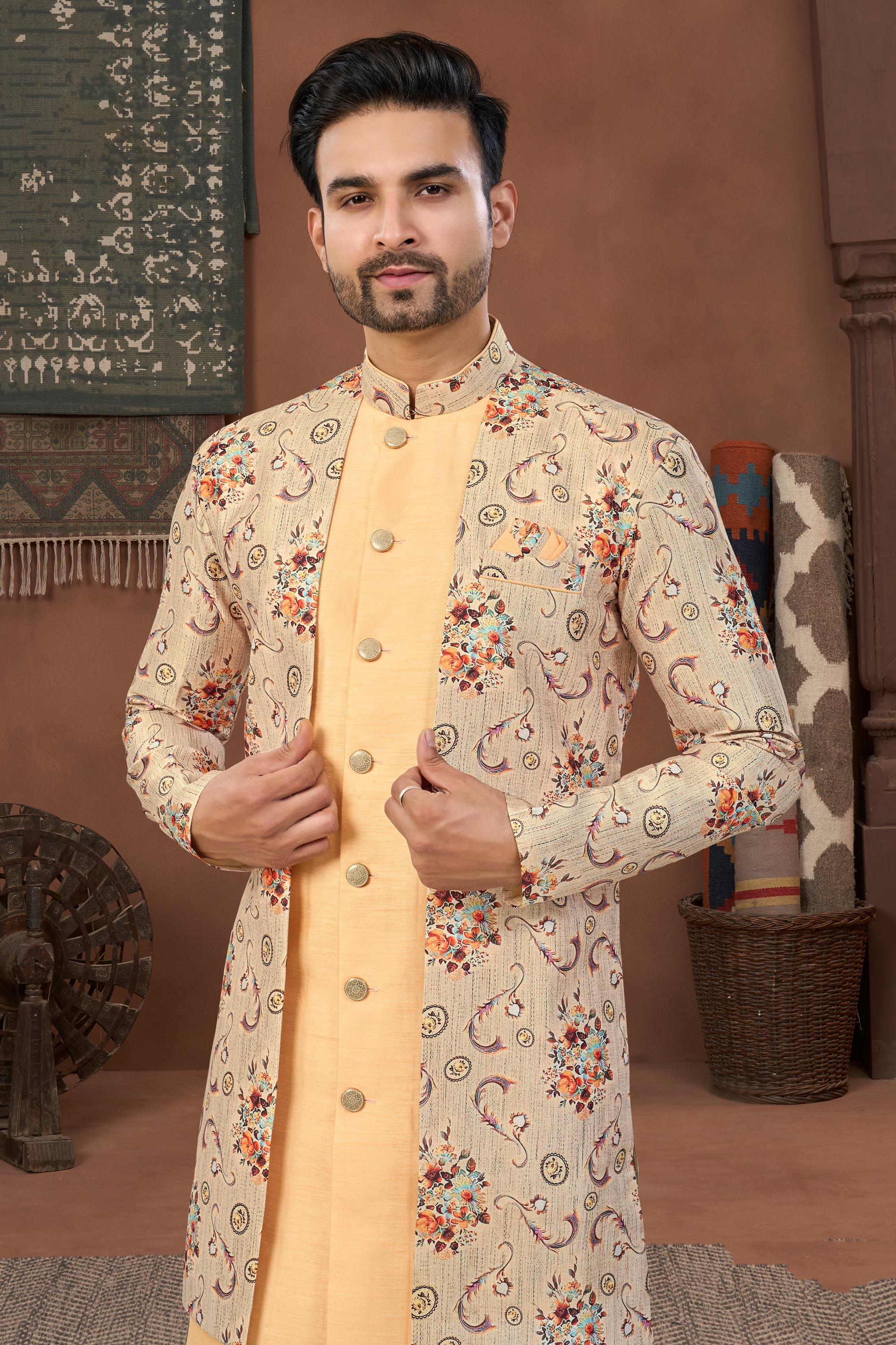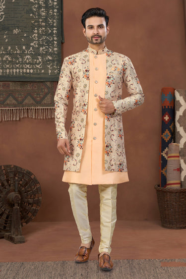 Banarasi Silk Fabric Peach Wedding Wear Readymade Indo Western For Men