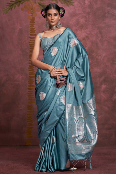 Banarasi Zari Weaving Sky Blue Color Beatific Satin Handloom Silk Saree