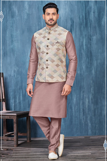 Beautiful Embroidery Work Coffee Color Wedding Wear Readymade Kurta Pyjama For Men With Jacket