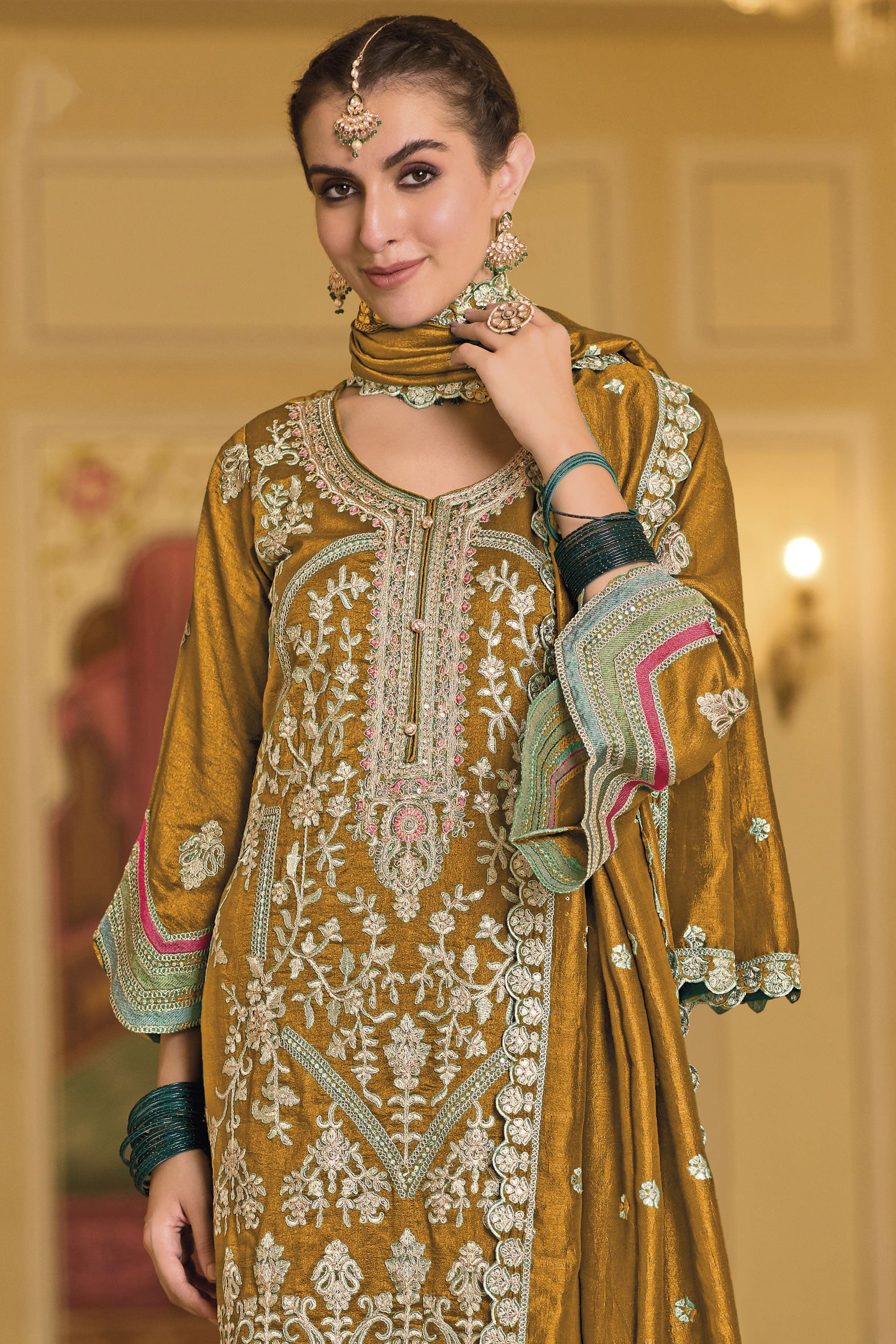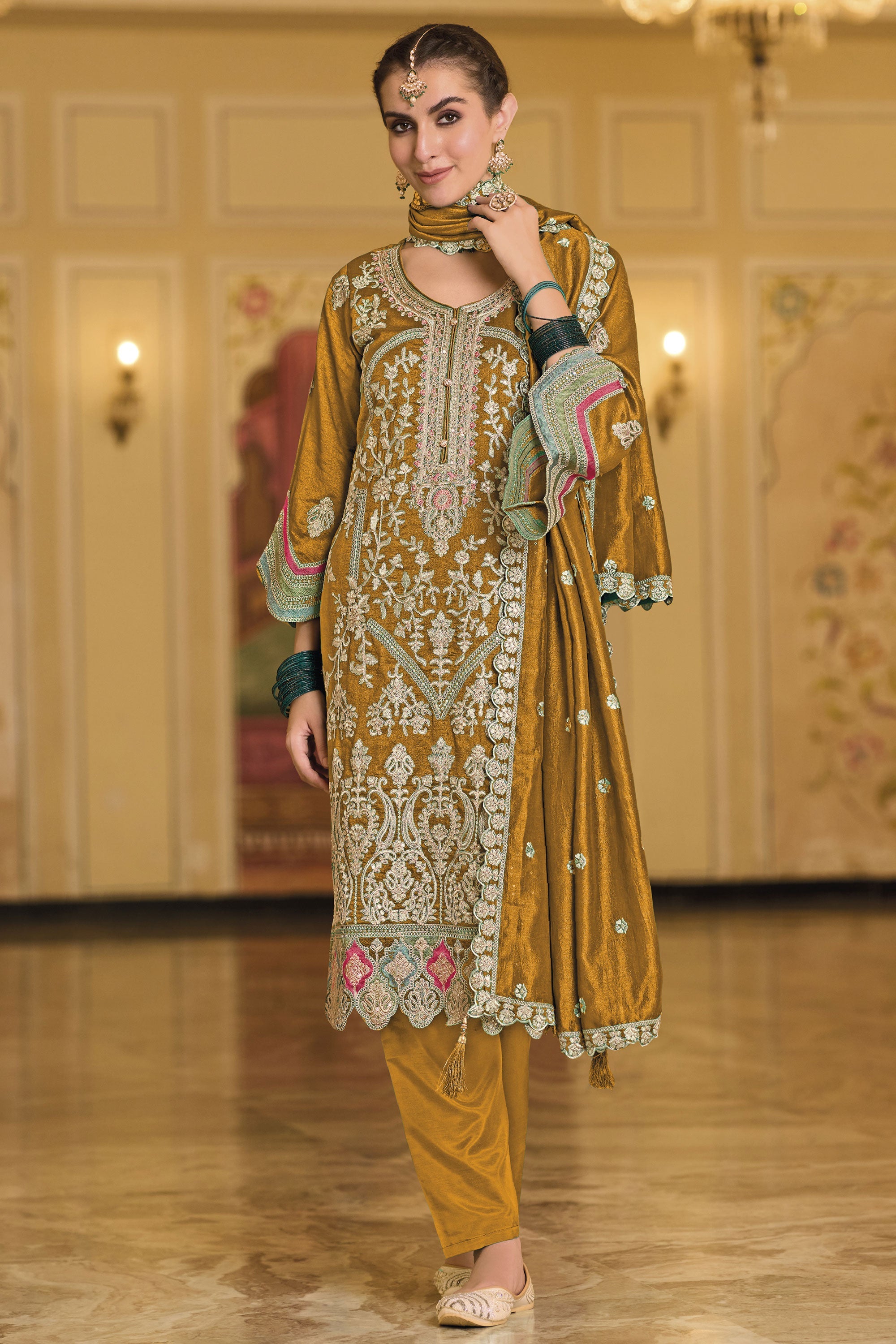 Beautiful Party Style Mustard Color Art Silk Fabric Readymade Salwar Suit