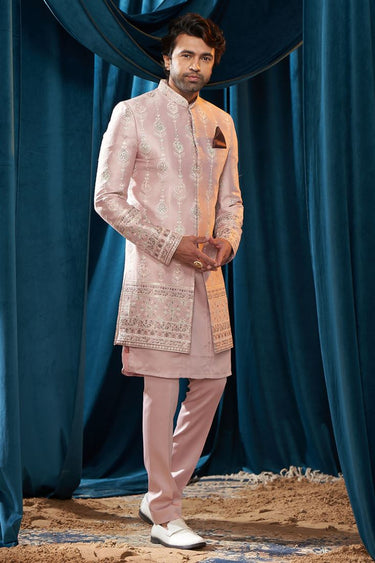 Beautiful Pink Color Wedding Wear Embroidered Readymade Indo Western For Men In Satin Fabric