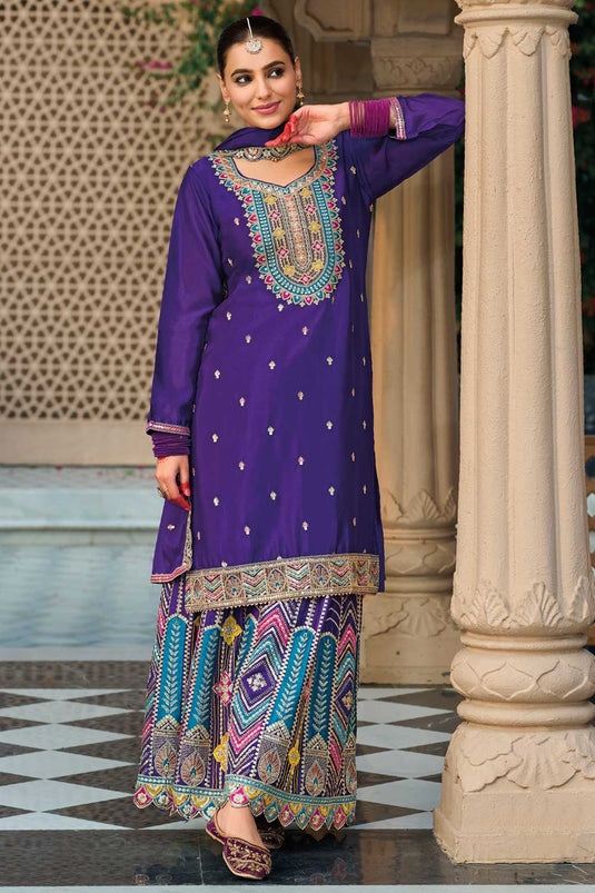 Beautiful Purple Color Readymade Palazzo Suit In Chinon Fabric