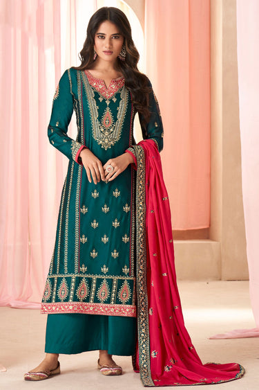Beautiful Teal Color Embroidered Art Silk Fabric Sangeet Wear Readymade Palazzo Suit