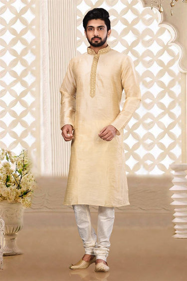 Beige Art Silk Graceful Readymade Men Kurta Pyjama For Festive Wear
