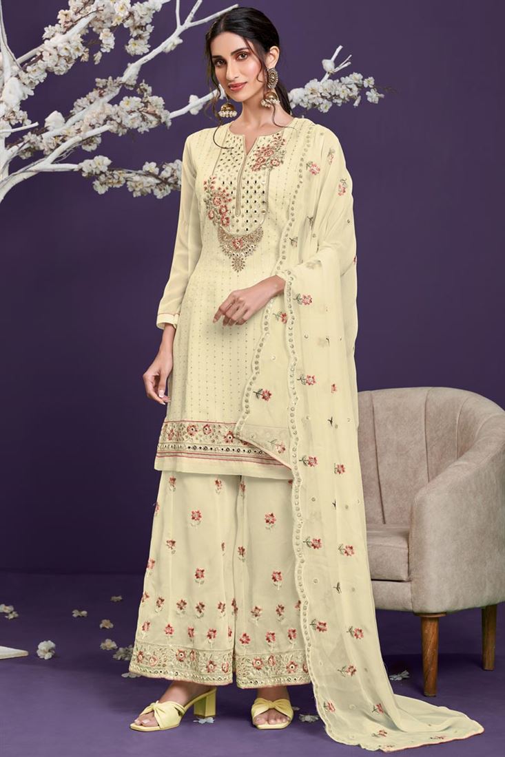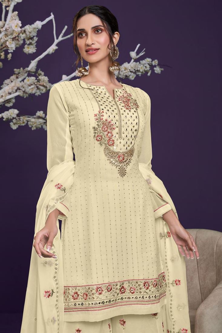 Beige Color Function Wear Embroidered Georgette Fabric Palazzo Suit