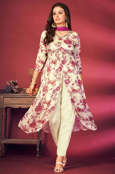 Beige Color Printed Readymade Anarkali Salwar Suit In Chinon Fabric