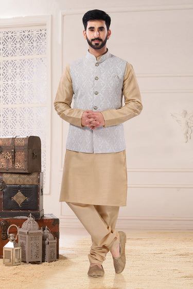 Beige Color Sangeet Wear Readymade Lovely Art Silk Fabric Kurta Pyjama For Men With 3 Pcs Jacket Set