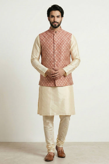 Beige Dhupion Fabric Function Wear Readymade Kurta Pyjama With Designer Jacket For Men