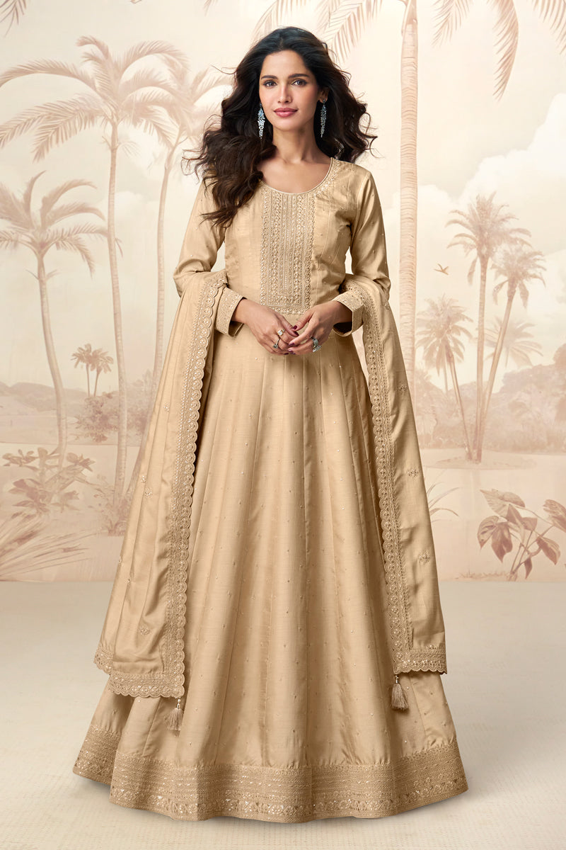 Beige Embroidered Floor Touch Readymade Anarkali Style Gown With Dupatta