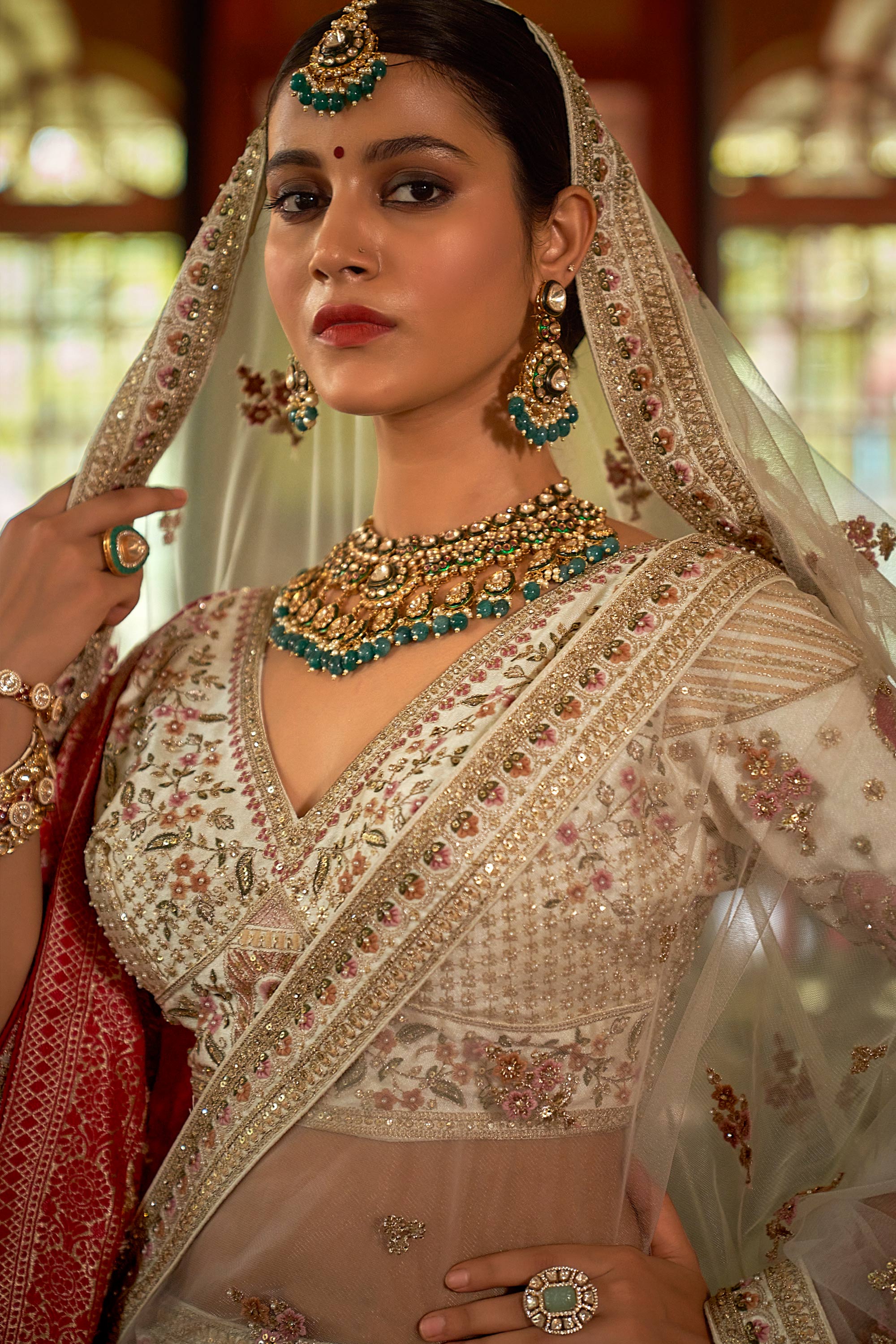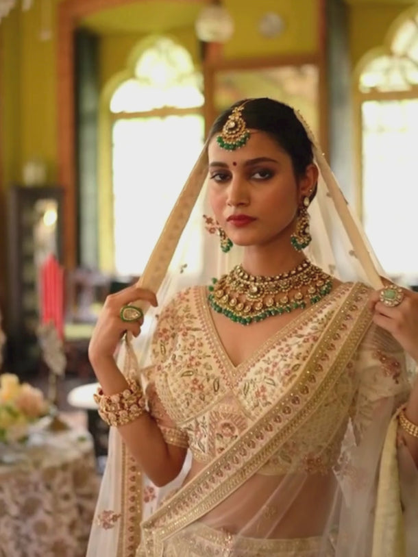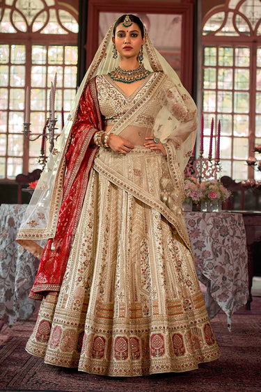 Beige Heavy Embroidered Designs Bridal Lehenga And Enigmatic Blouse