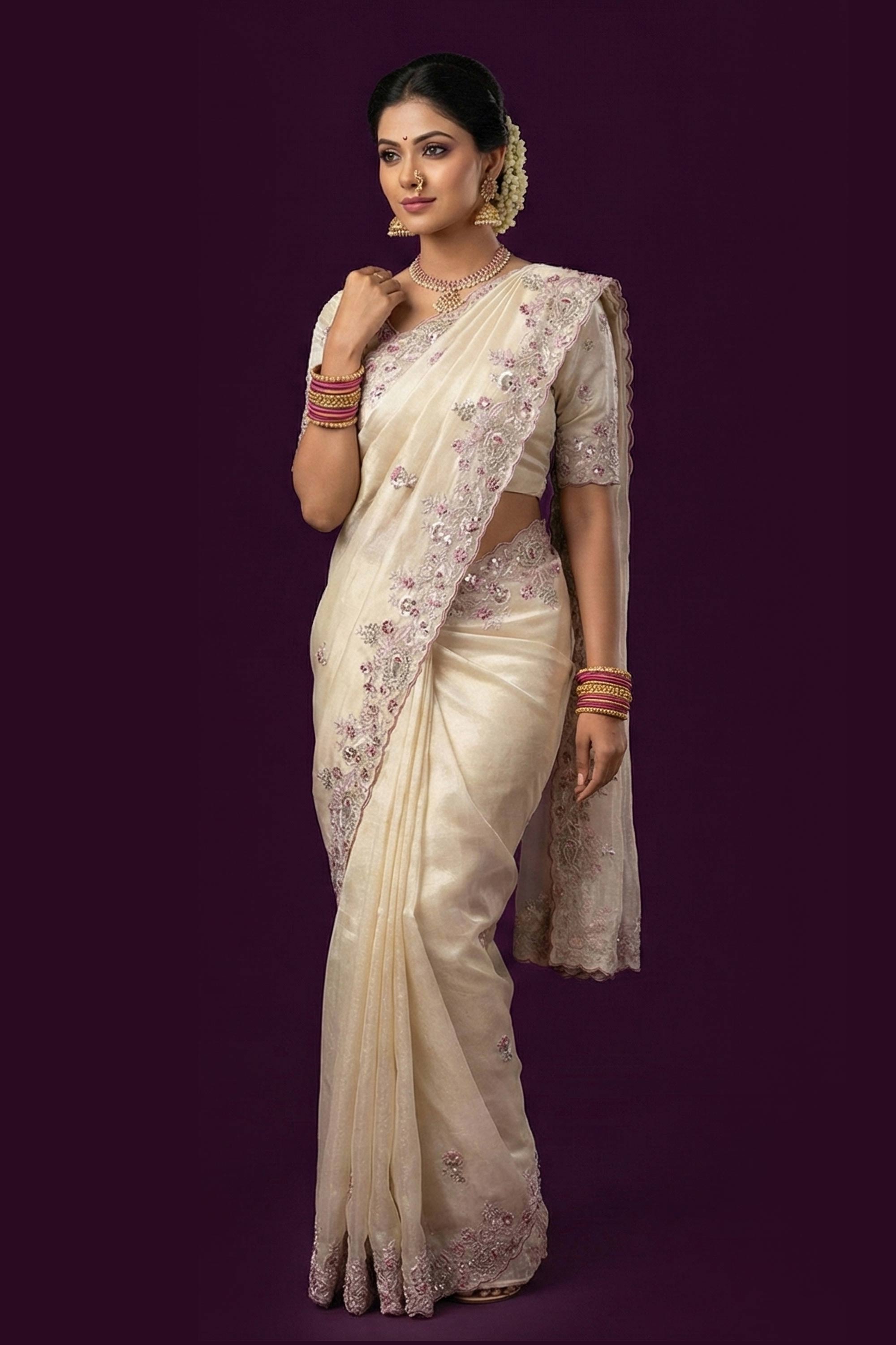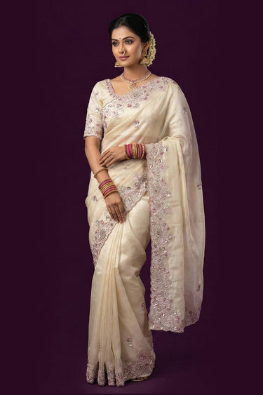Beige Sangeet Wear Tissue Silk Embroidered Saree