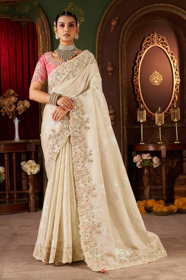 Beige Wedding Wear Art Silk Embroidered Border Work Saree