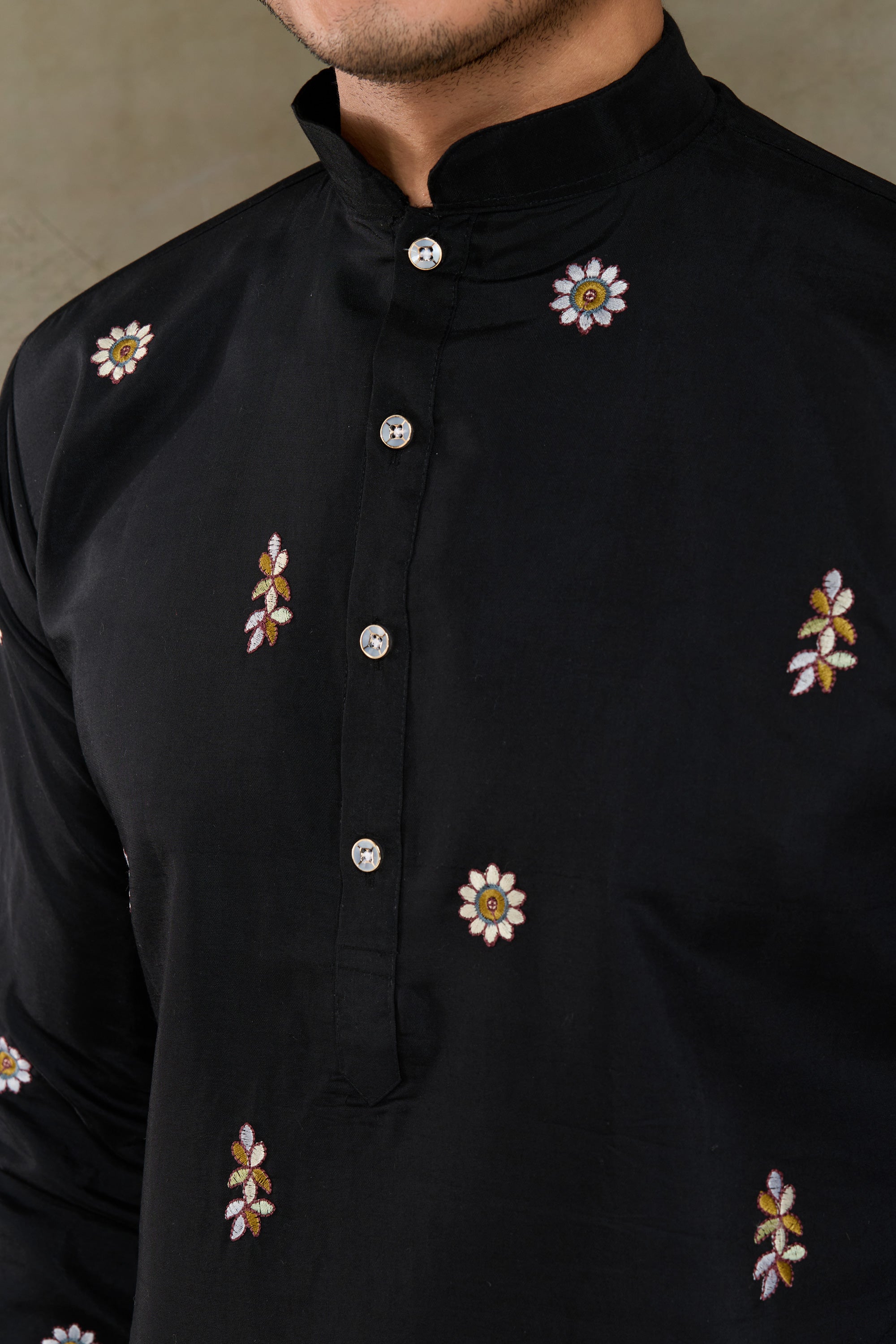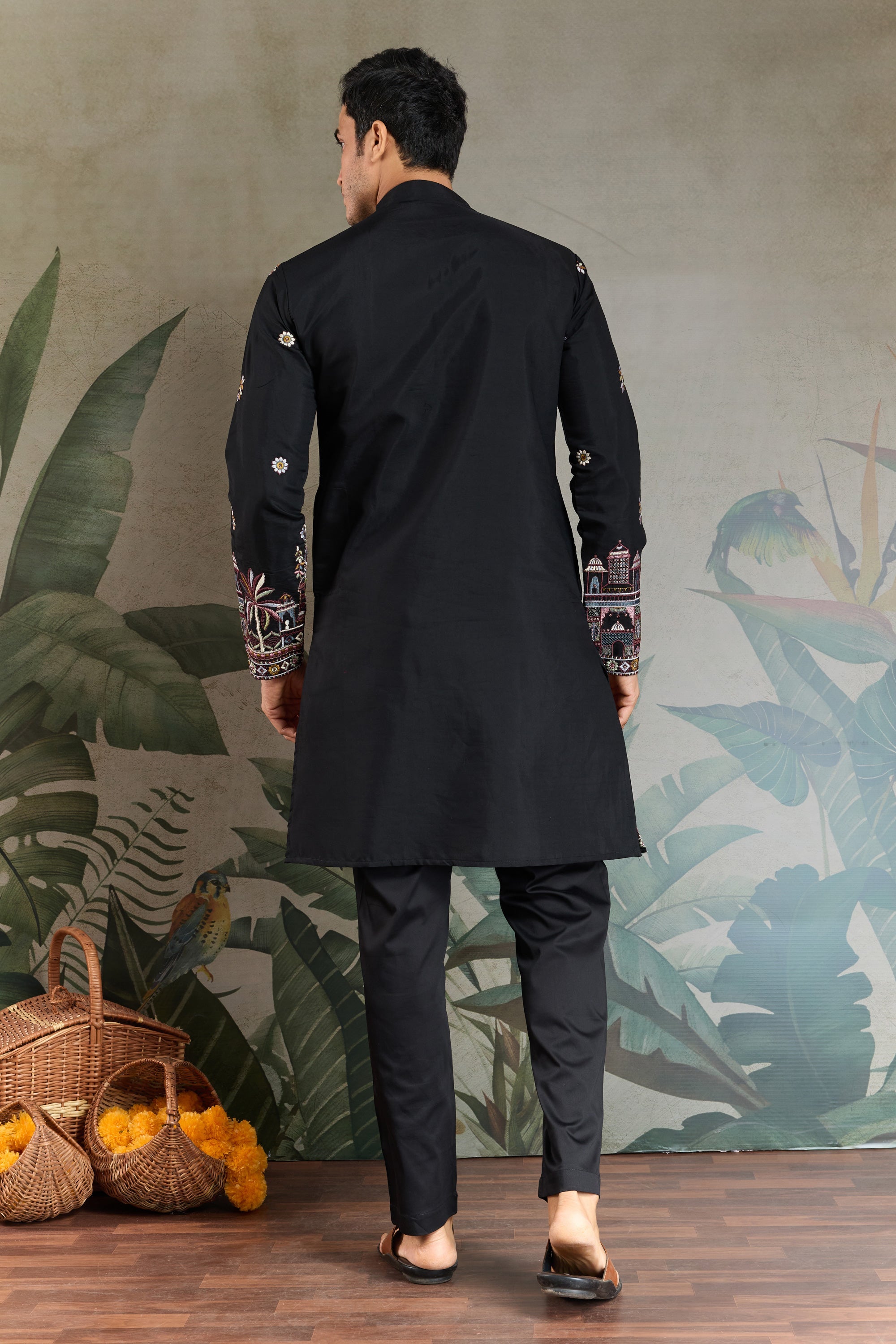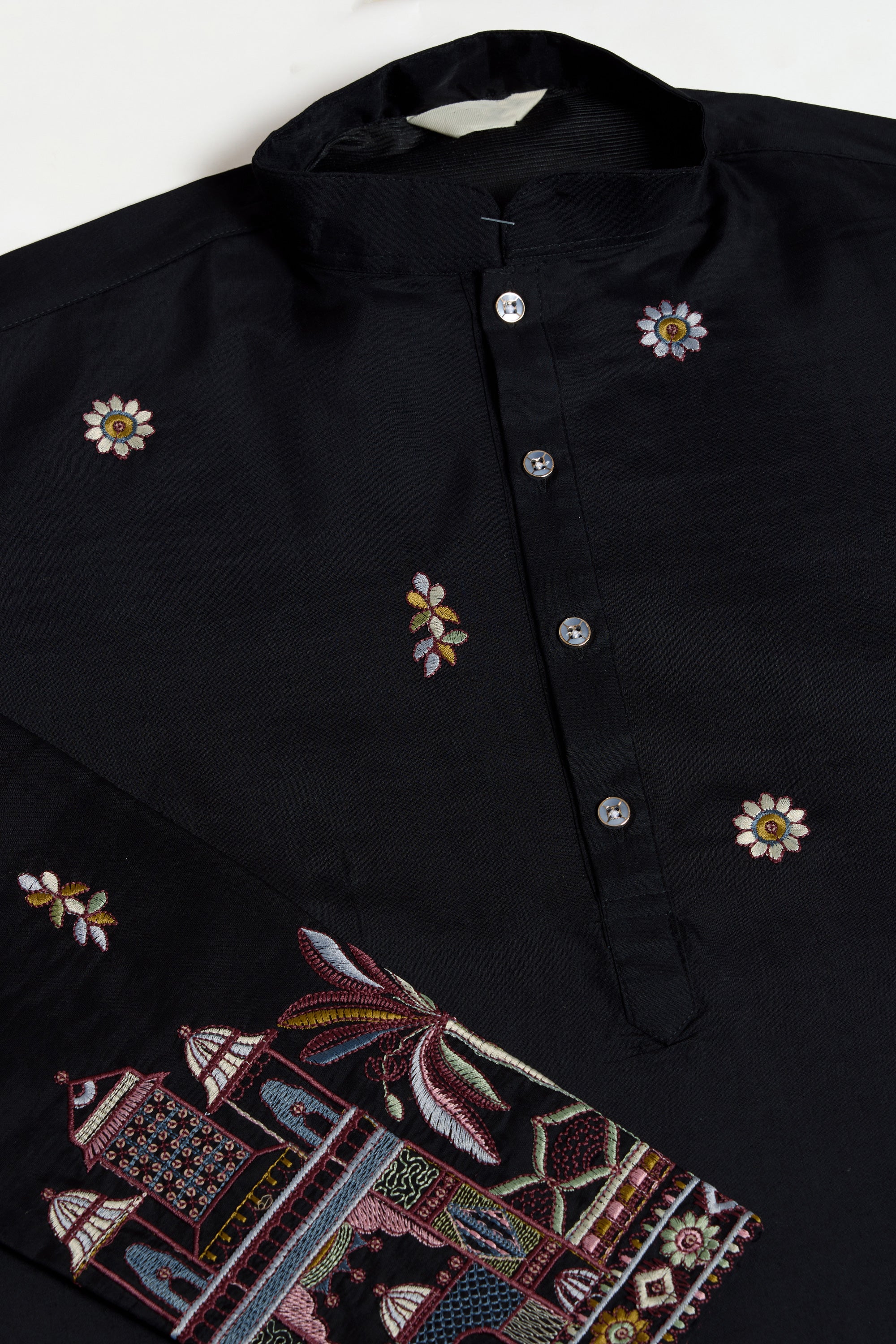 Black Embroidery Work Viscose Silk Readymade Men Kurta With Dupatta