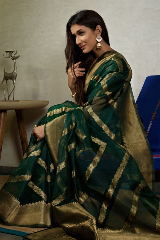 Blazing Dark Green Color Organza Fabric Weaving Work Saree