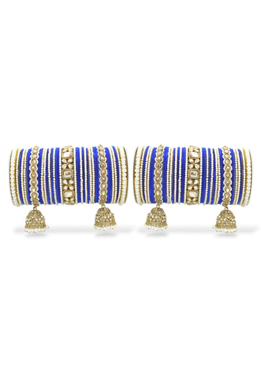 Blue Color Alloy Material Precious Jhumki Bridal Set With Pearl Kadas