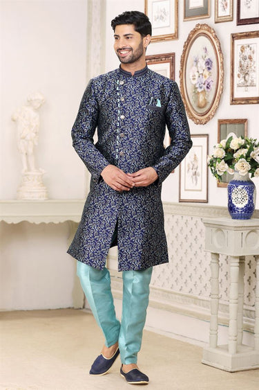 Blue Color Jacquard Fabric Designer Readymade Indo Western For Men