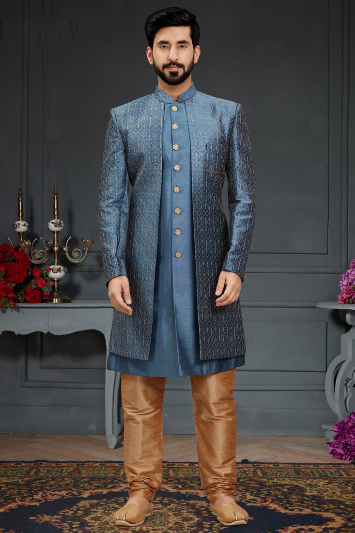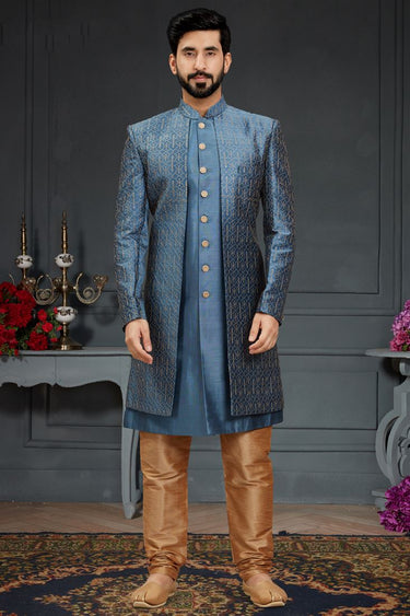 Blue Silk Fabric Magnificent Readymade Men Indo Western For Wedding Wear