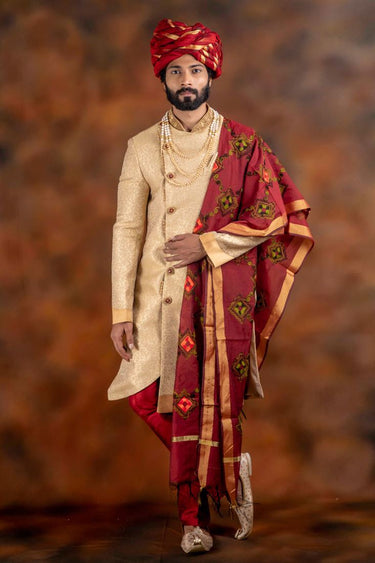 Brilliant Art Silk Fabric Cream Color Wedding Wear Indo Western For Man