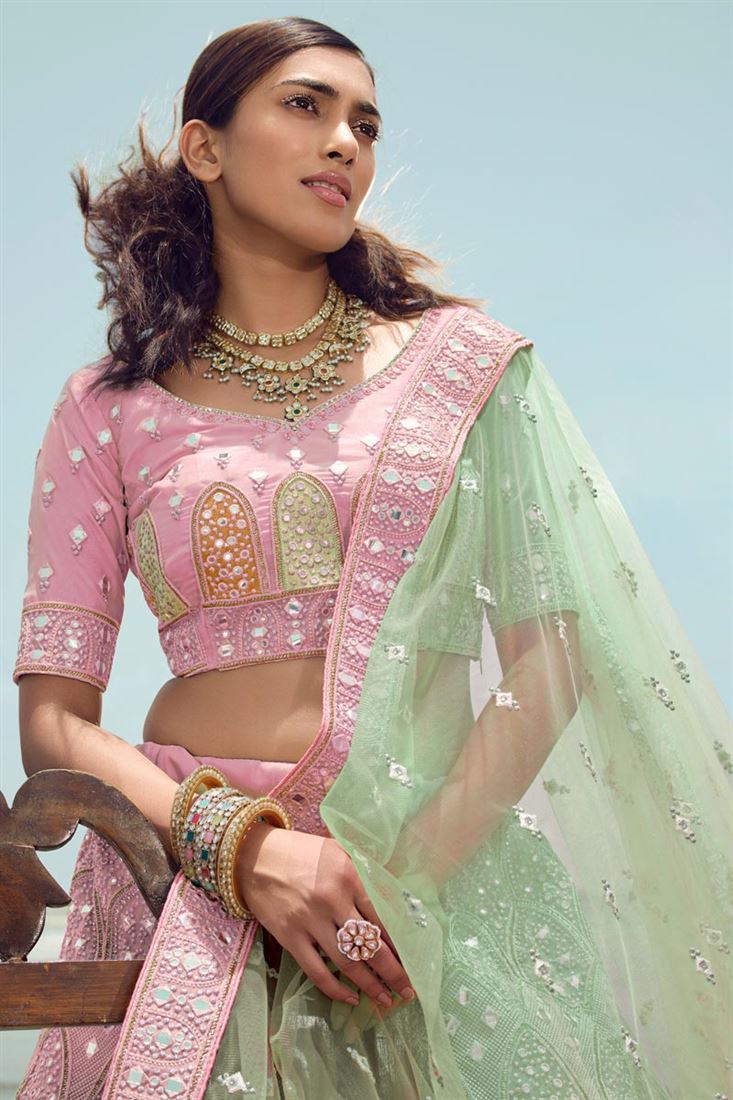 Brilliant Organza Fabric Embroidered Lehenga In Pink Color