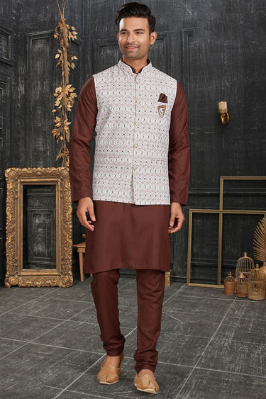 Brown Color Cotton Fabric Engrossing Kurta Pyjama With Jacket