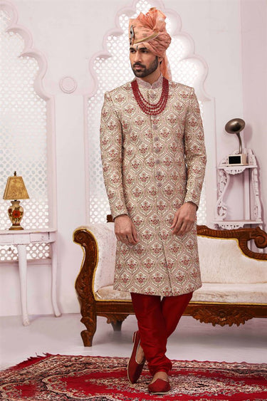 Captivating Beige Color Banarasi Silk Fabric Heavy Embroidered Designer Groom Sherwani