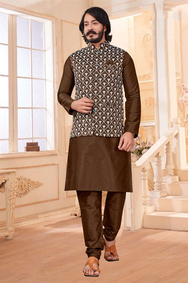 Captivating Brown Color Art Silk Fabric Sangeet Wear Readymade Kurta Pyjama With Trendy Jacket