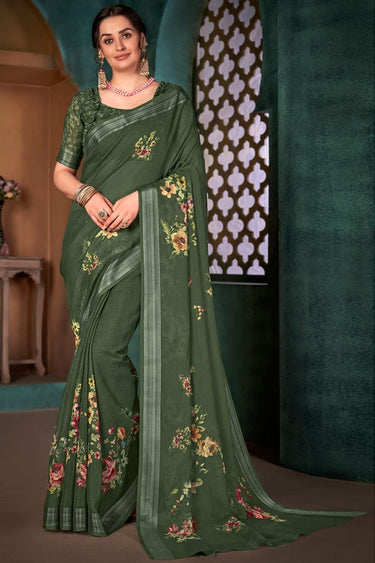 Casual Wear Cotton Linen Fabric Green Color Enticing Digital Printed Saree