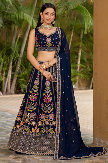 Charming Navy Blue Color Georgette Fabric Sequins Embroidered Lehenga