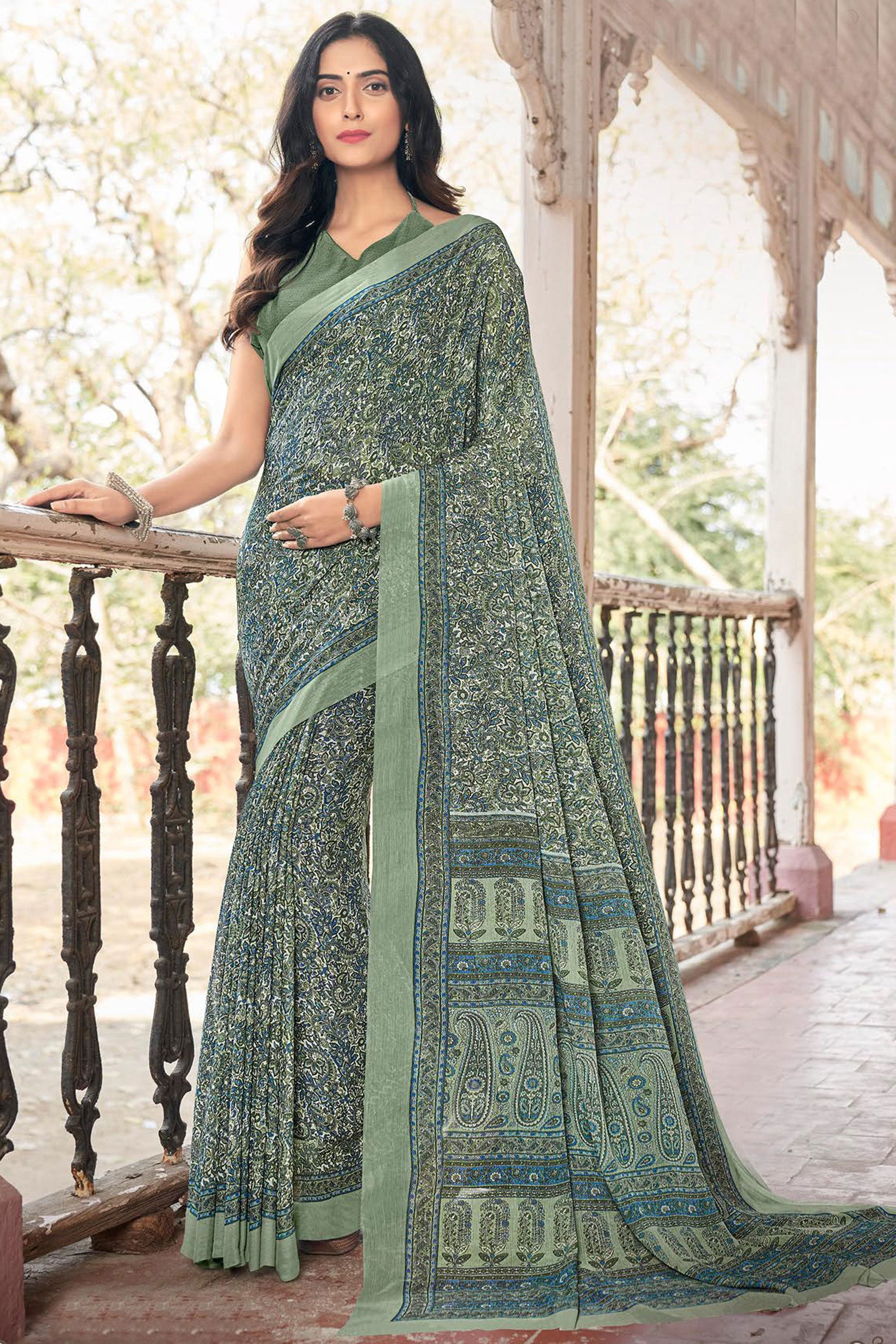Chiffon Fabric Printed Sea Green Color Daily Wear Saree