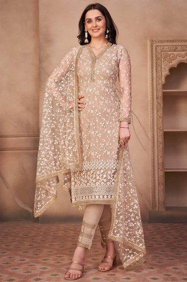 Chikoo Color Net Fabric Festival Wear Embroidered Imposing Salwar Suit