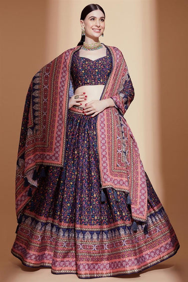 Chinon Fabric Embellished Navy Blue Color Printed Lehenga