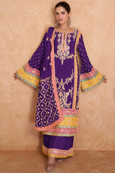 Chinon Fabric Embroidered Readymade Palazzo Salwar Kameez In Purple Color