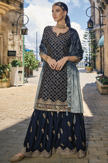 Chinon Fabric Navy Blue Color Festive Wear Embroidered Readymade Palazzo Salwar Kameez