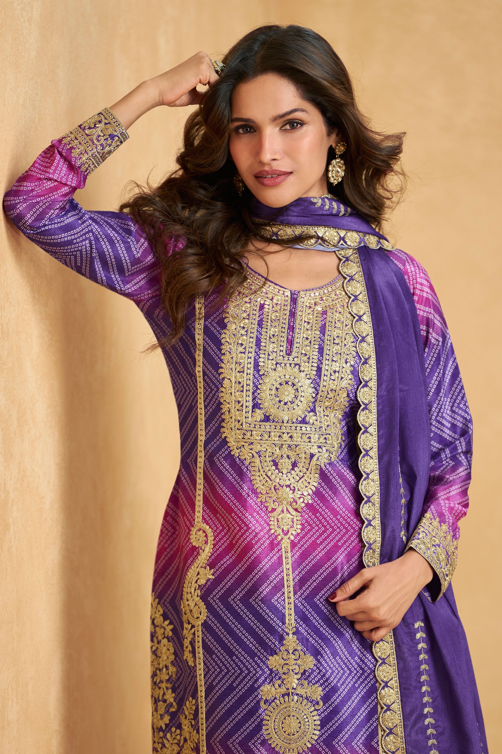 Make a lasting impression with the Chinon Silk Embroidered Readymade Sharara Style Salwar Kameez. Crafted with rich chinon silk fabric, this elegant outfit features intricate embroidery, exuding grace and charm for every occasion. The sharara design offers both comfort and style, perfect for festive celebrations, weddings, or evening gatherings. This ready-to-wear ensemble eliminates the hassle of stitching, making it convenient and time-saving. Pair it with statement jewelry and heels to complete your sophisticated look. Feel confident and beautiful while turning heads wherever you go. A must-have addition to your ethnic wardrobe.