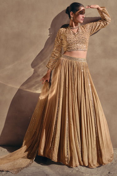 Chinon Silk Fabric Beige Color Embroidered Readymade Lehenga Choli
