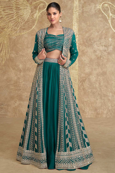 Chinon Silk Fabric Captivating Dark Cyan Color Readymade Lehenga With Jacket