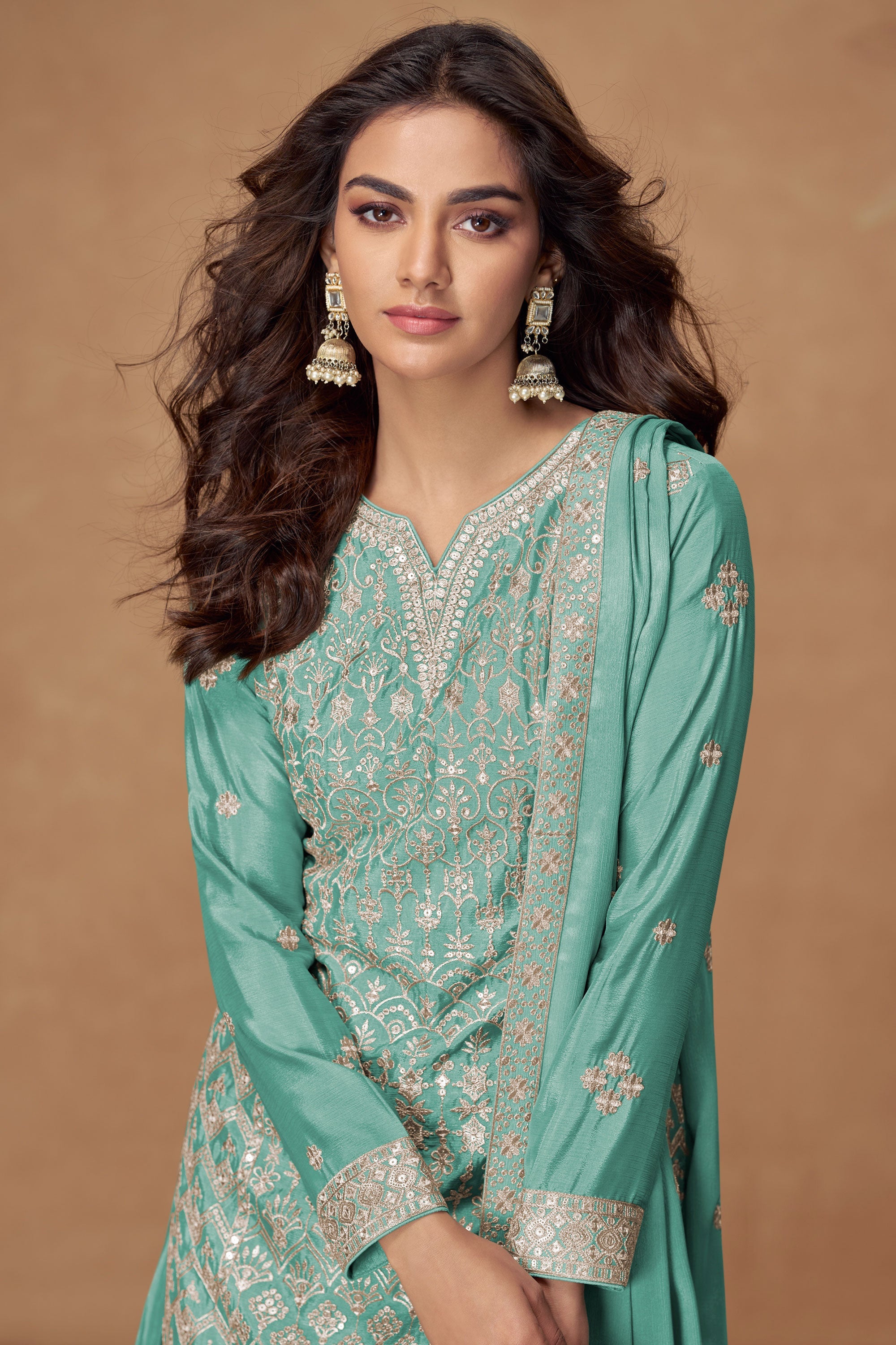Chinon Silk Light Cyan Color Embroidered Readymade Palazzo Salwar Suit